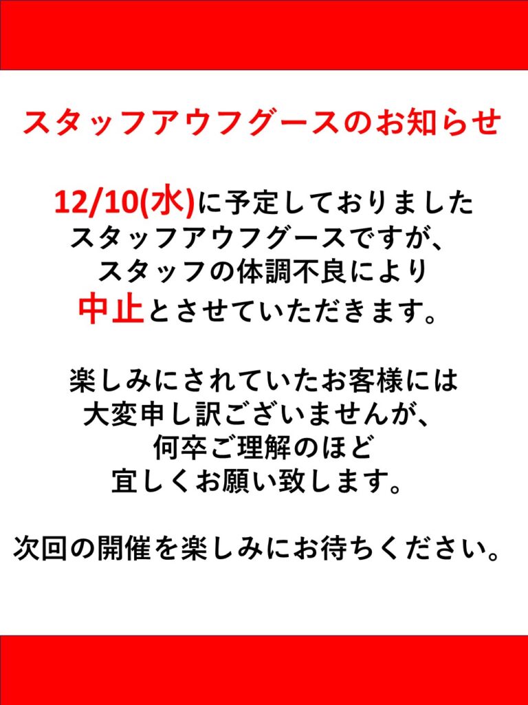 12/10(水)に予定しておりました、当店スタッフの恵本によるスタッフアウフグースですが、スタッフの体調不良により中止の運びとなりました。
