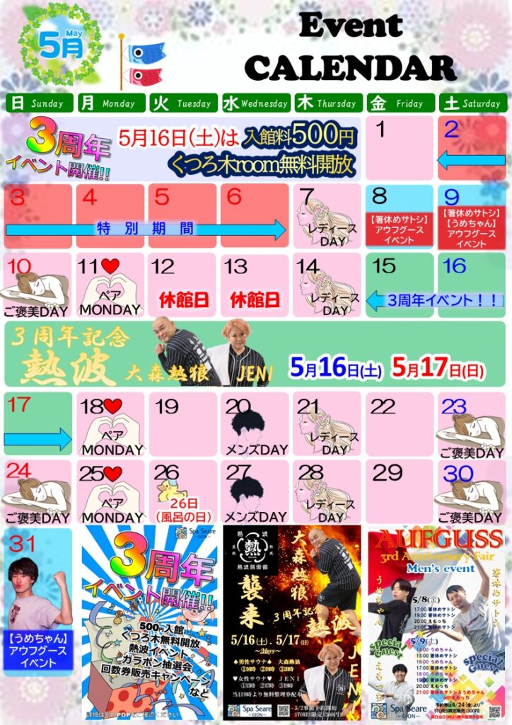 スパシーレ祗園の5月イベントカレンダーが完成いたしました😊😊